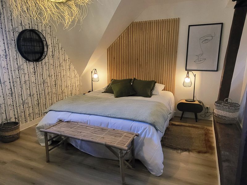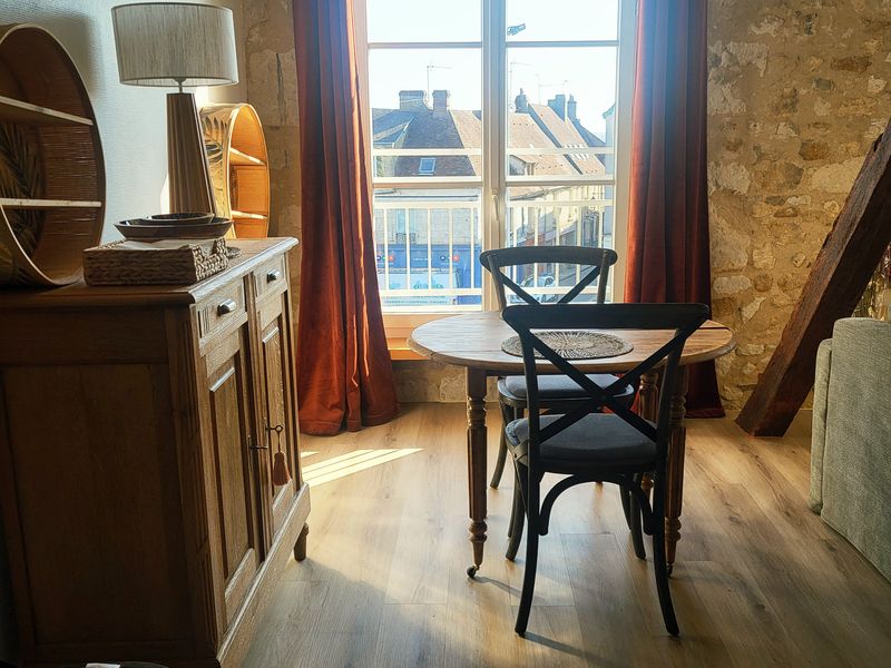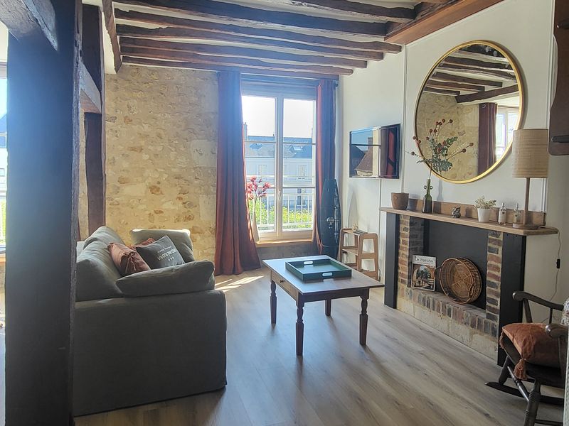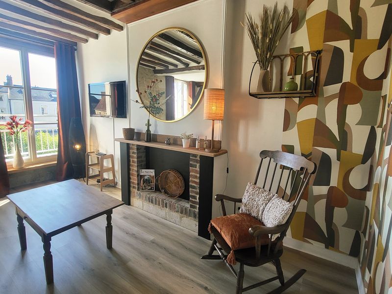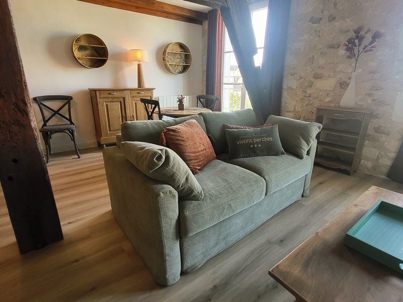 Le Perchoir Cosy vous accueille à Mortagne-au-Perche, au cœur d'un bourg pittoresque et vivant. Une petite cité de caractère au cœur du Perche, qui allie histoire, terroir et douceur de vivre. Vous séjournerez dans un appartement de charme de 60 m2, niché sous des poutres apparentes, entre authenticité confort et élégance. Un cocon fraichement rénové avec goût, mêlant vintage et modernité. Parking gratuit à proximité immédiate. Cet appartement est situé au 2ème étage d'un immeuble qui accueille au rez-de-chaussée une boutique de décoration. Vous y accédez par une entrée indépendante après avoir ouvert la porte coulissante du porche commun.