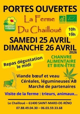 La Ferme du Chailloué vous ouvre ses portes. Au programme : - visite de la ferme : trieurs, animaux... - vente de viande de boeuf et veau, céréales, légumineuses AB - marché de partenaires - chanvre alimentaire et bien-être - repas dégustation le midi