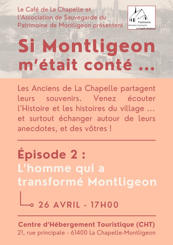Le Café de La Chapelle et l'Association de Sauvegarde du Patrimoine de Montligeon présentent "Si Montligeon m'était conté...". Les anciens de La Chapelle-Montligeon partagent leurs souvenirs. Venez écouter l'Histoire et les histoires du village... et surtout échanger autour de leurs anecdotes, et des vôtres !