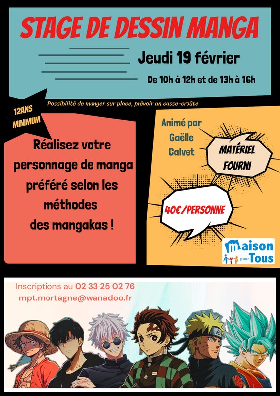 Stage de dessin animé par Gaël Calvet. Réalisez votre personnage de manga préféré selon les méthodes des mangakas ! A partir de 12 ans. Matériel fourni. Possibilité de manger sur place, prévoir son pique-nique.